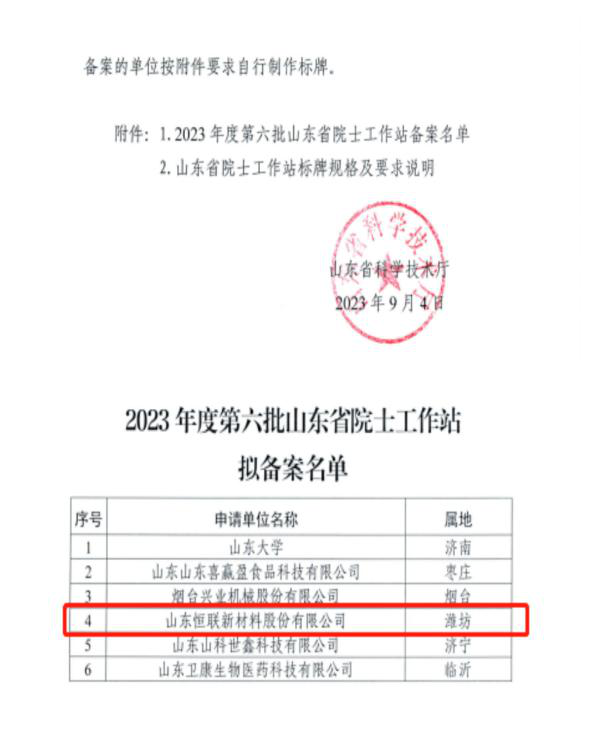 9月4日,山東省科技廳公布了2023年度第六批山東省院士工作站備案名單,山東恒聯(lián)新材料股份有限公司院士工作站名列其中,有幸成為今年以來濰坊市首個成功備案的省級院士工作站。